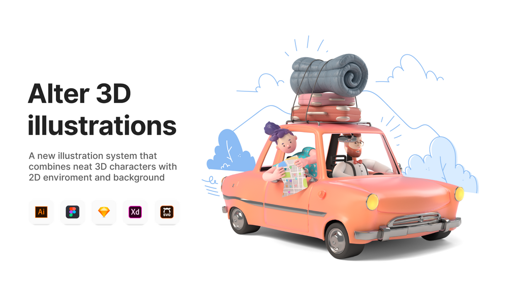 Alter 3D Illustrations offers a diverse range of formats, each with its unique strengths. The 3D illustrations are meticulously crafted raster graphics, adding depth to your designs. In contrast, the 2D background elements are vector-based, ensuring scalability and flexibility. The available formats include Ai source files, SVG for web graphics, PNG with a transparent background, Sketch for seamless design integration, Figma for collaborative design, and Adobe XD for prototyping.