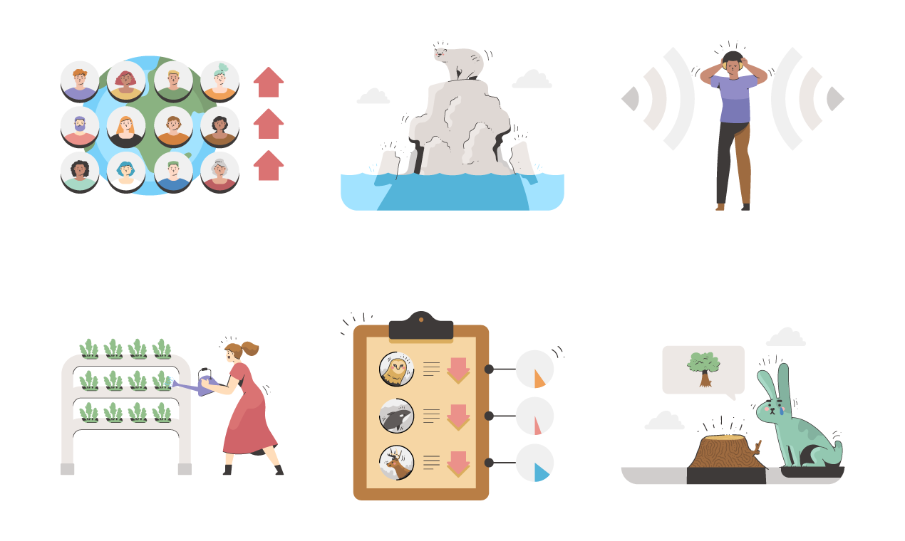 Designed in a flat style with delicate, thin strokes, these illustrations maintain simplicity while encapsulating the intricate issues surrounding our environment. Within this pack, you'll find compelling visuals that spotlight topics like air pollution, endangered species, overpopulation, wildfires, global warming, sustainability, and the ethos of green thinking. Each scene serves as a poignant commentary on the critical subjects that shape our world today.