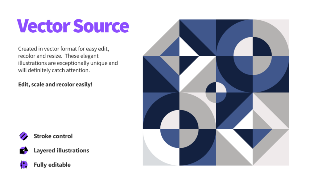 Unlock the potential of these geometric masterpieces as you edit, recolor, and modify them to suit your vision. Available in Ai, SVG, Figma, Iconjar, and PNG formats, these patterns offer flexibility across a variety of design platforms. The high contrast and harmonious color palettes make them an ideal choice for UI design and backgrounds, providing the perfect backdrop for your visual storytelling.