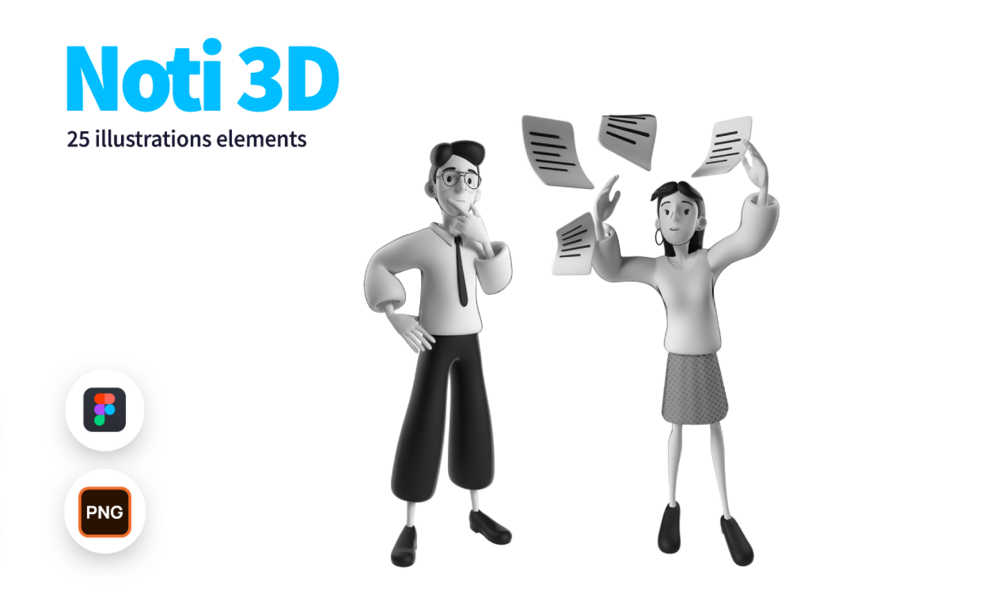 Step into the realm of creativity with Noti 3D Illustrations, a captivating pack featuring 25 black and white 3D elements tailored for Notion templates and adaptable to any design endeavor. Whether you're a teacher, designer, or business professional, these illustrations inject a fresh breath of creativity into your projects, elevating them to new levels of visual appeal and sophistication.