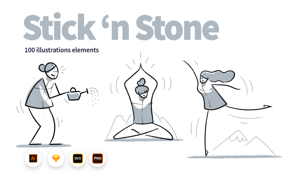 Simplicity and playfulness unite in Stick 'n Stone Illustrations, a delightful collection of 100 vector elements. In an era where basic elements are often underestimated, this set returns to the essence of design with grace. Formats available include Ai, SVG, and PNG, catering to your every creative need.